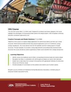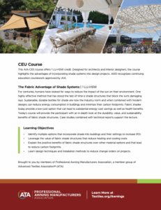 For centuries, humans have looked for ways to reduce the impact of the sun on their environment. One highly effective method that has stood the test of time is shade structures that block the sun’s damaging rays. Sustainable, durable textiles for shade are now the industry norm and when combined with modern designs can reduce energy consumption in buildings and minimize their carbon footprints. Fabric shades today provide a low-cost option that can lead to substantial energy cost savings as well as health benefits. Today’s course will provide the participant with an in-depth look at the durability, value, and sustainability benefits of fabric shade structures. Case studies combined with technical reports support the lecture.